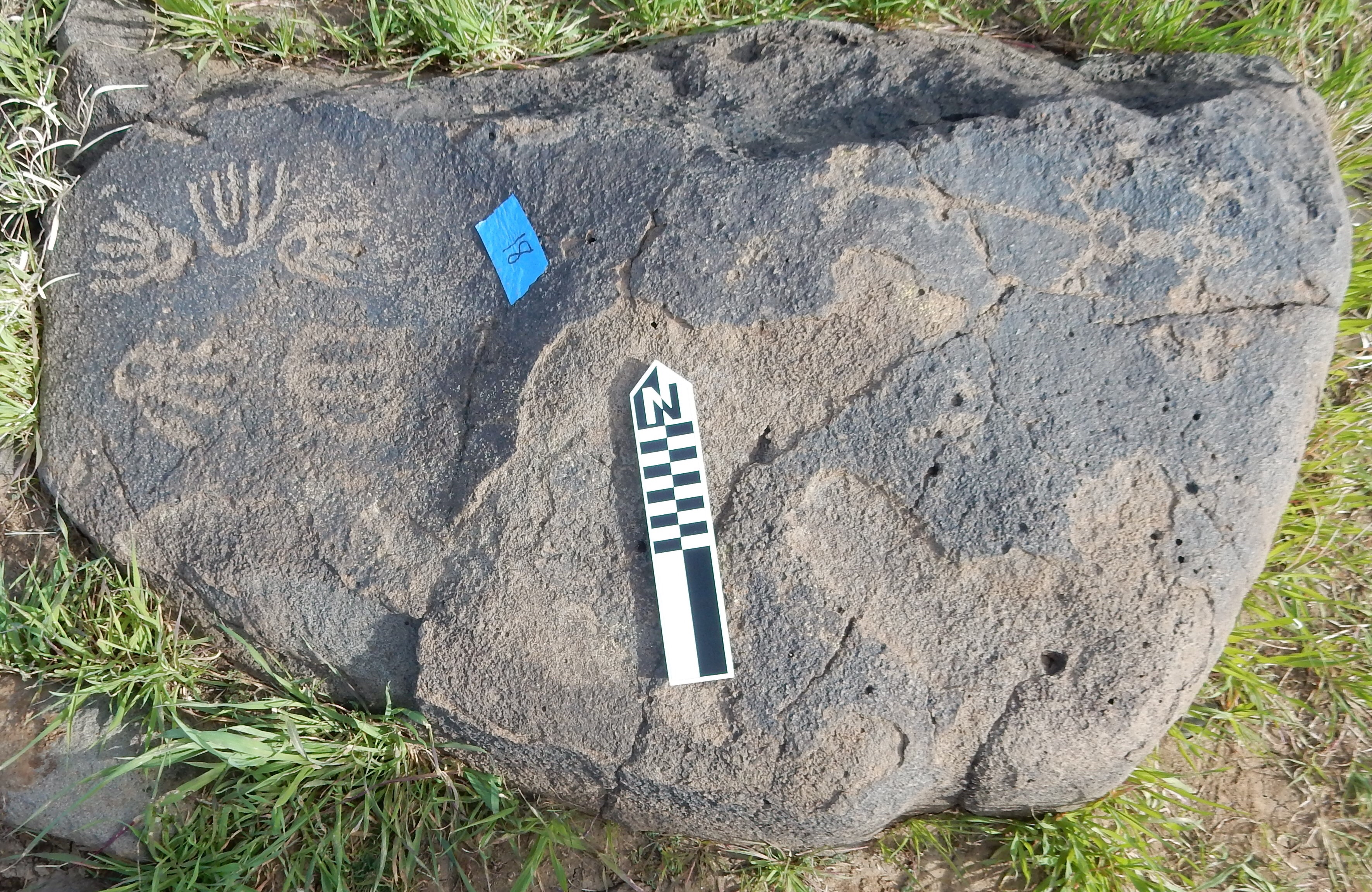 We recently documented a prehistoric site on the Agua National Monument. It was comprised of two habitation structures, nine grinding slicks, 30 Petroglyph boulders and several hundred artifacts like pottery sherds, lithic debitage, metates and manos. The site itself was over 100 meters long and 30 meters wide oriented on a NW/SE axis. It was located 2.1 KMs north of another well known reference point. (I’ve described it this way to avoid telling anyone exactly where it was located.)